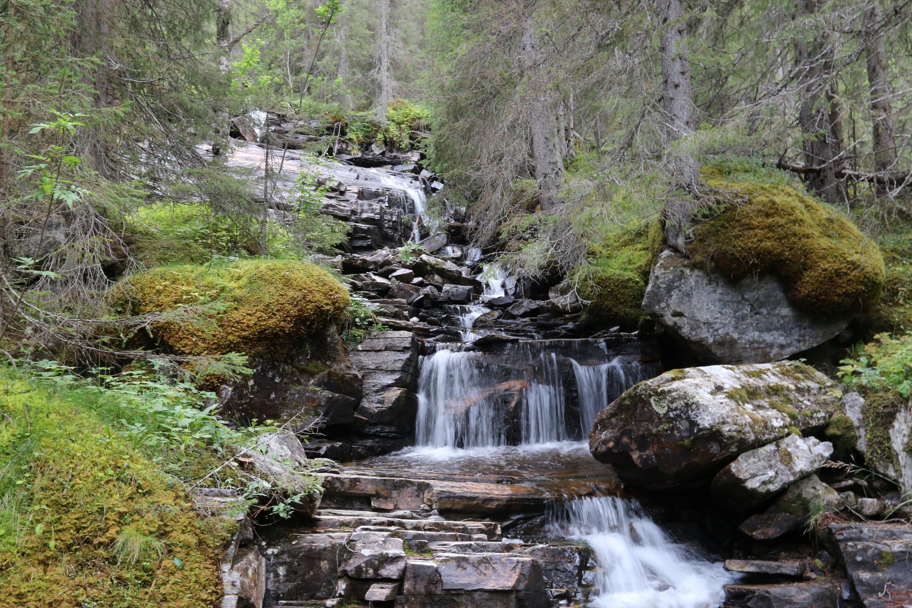 Västra Kvarnbäcken bildar många små vattenfall på sin väg genom den lite trolska skogen